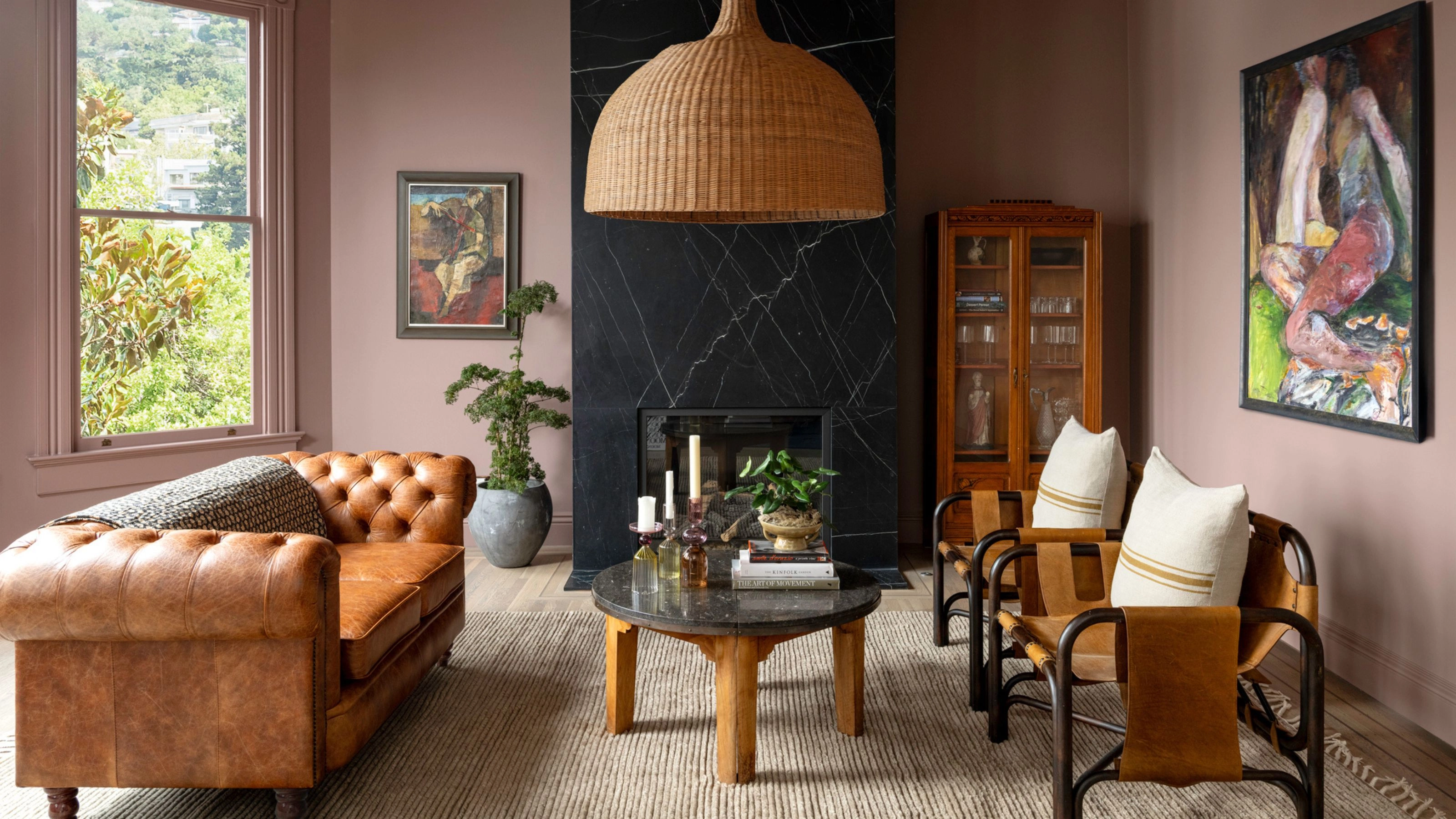 “The combination of the color and materials works so well in this space because of the balance of contrast and warmth,” says Thecla Glueck, founder and lead designer of California-based interior design studio Thecla Glueck Design, who drenched the space pictured above from trim to ceiling in Farrow & Ball’s Sulking Room Pink to soften and take the edge off the black marble fireplace. “The rich natural elements keep the pink from feeling sweet or precious, and create a beautiful tension — the space feels calm, grounding, and really easy to be in.”