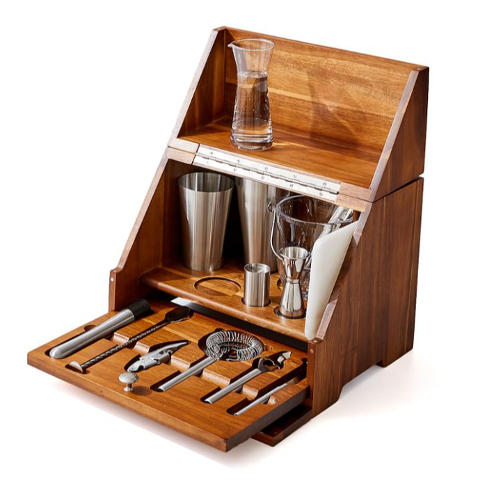 Similar, but different. This set from Wayfair, the vessel for which is also cherry-stained acacia wood, comes with 19 stainless steel bar tools, including one two-piece shaker and one marble cutting board.
