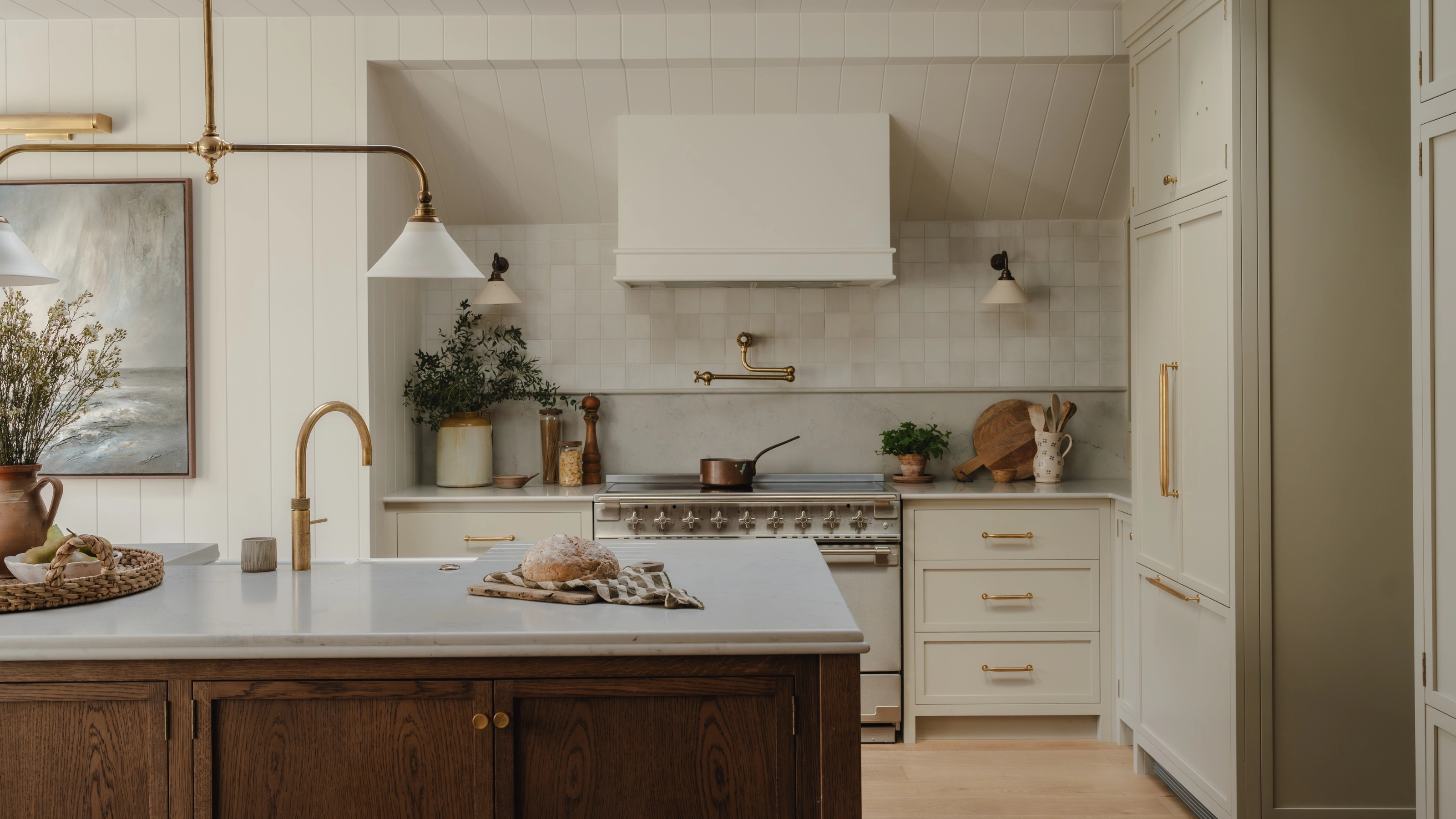 An off-white kitchen feels bright and airy, and pairs well with gold hardware and wood details.