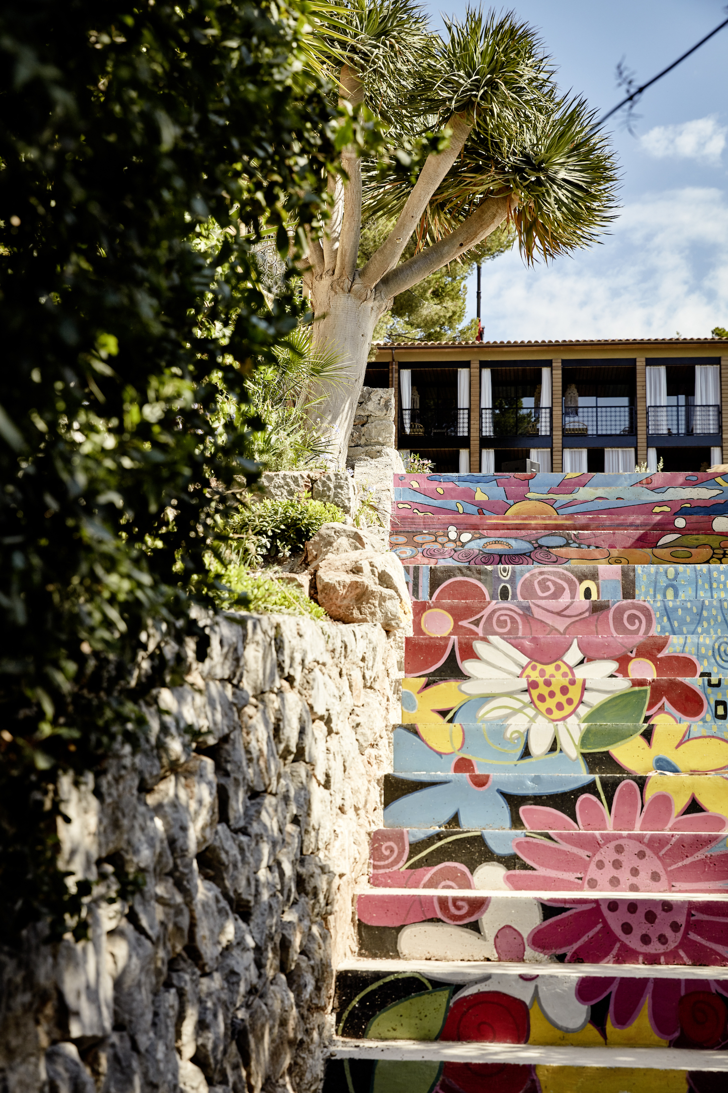 There’s a definite air of digital-nomad boho chic at this boutique bolthole, also set to the backdrop of the sea and mountain. The design is a joyous, colorful affair courtesy of Armin Fischer who has filled the 1970s structure with vibrant features like rattan lampshades and bed frames, rainbow-colored murals and even an ultra-kitsch floral peace sign on the bottom of the pool’s tile.
