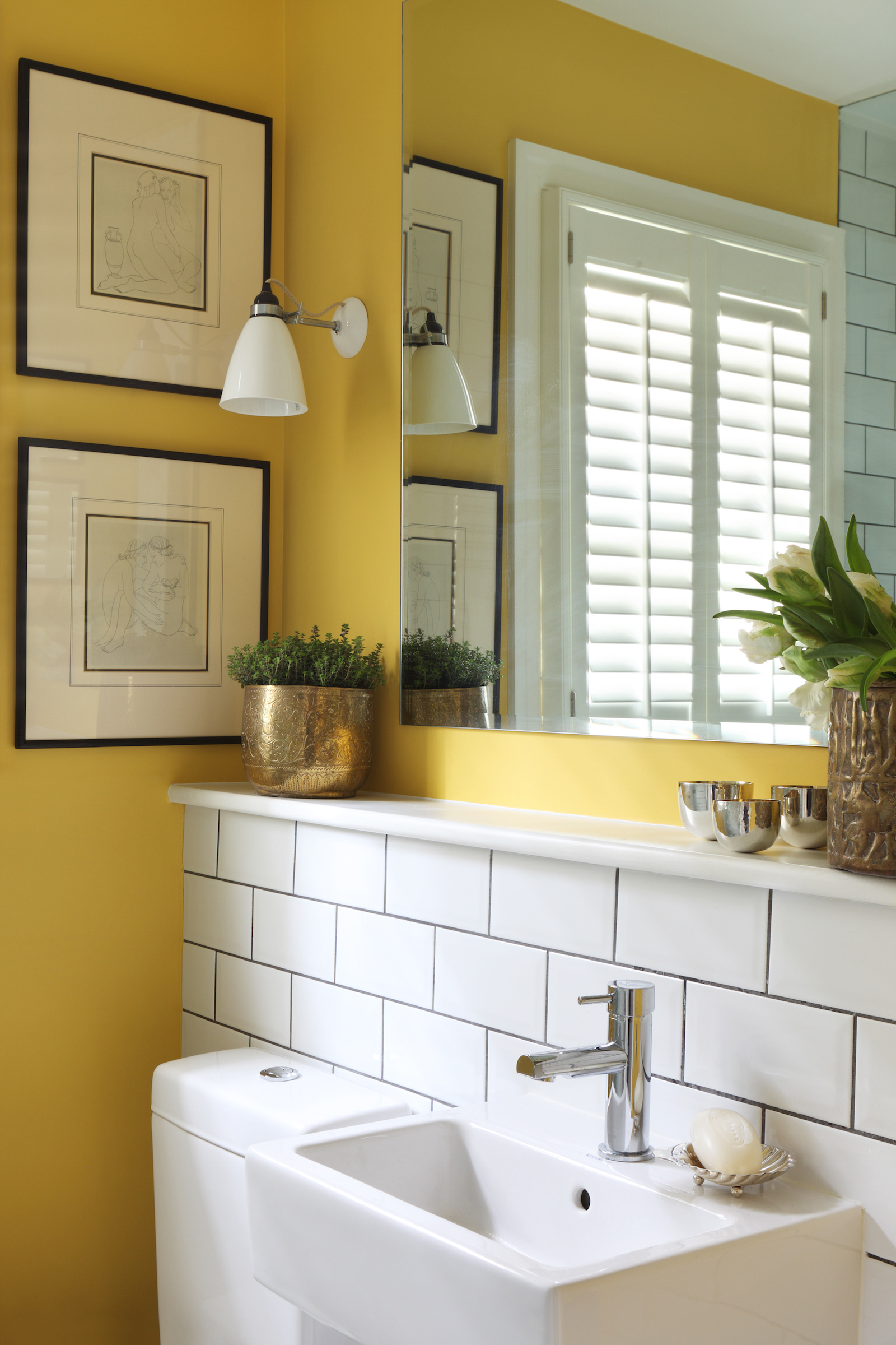 The kids' ensuite bathroom continues the modern traditional theme, with vintage artworks, traditional wall lights and a metro tiled shower area. Warm, saffron yellow is an unexpected bathroom colour choice but feels sunny, happy and friendly.