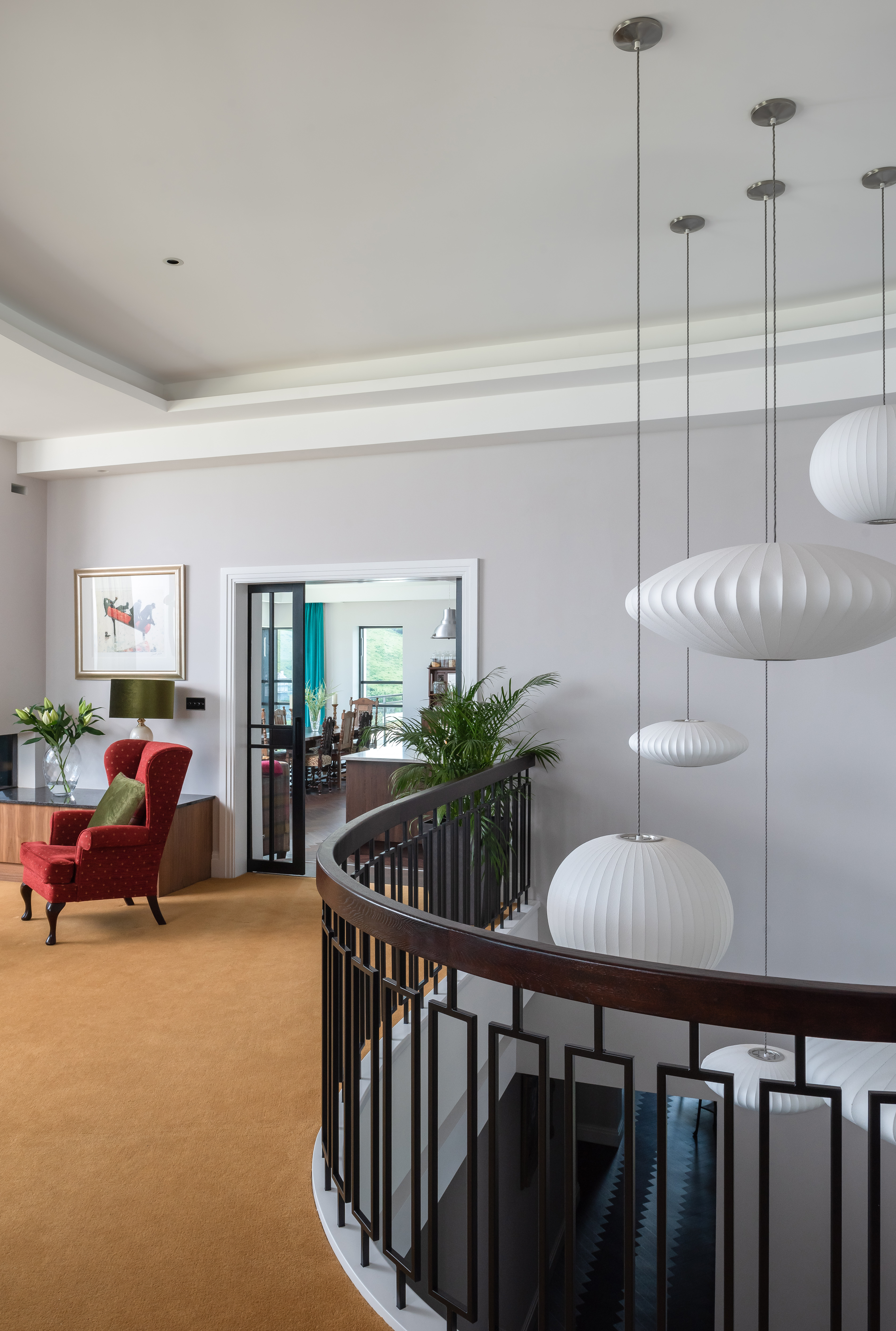 On the other side of the living room is a more casual space with sofas and a stylish, simple fireplace. Crittall doors lead through, to the kitchen and a sweeping staircase that's reminiscent of something from a 1920's ocean liner fills the corner of the room.