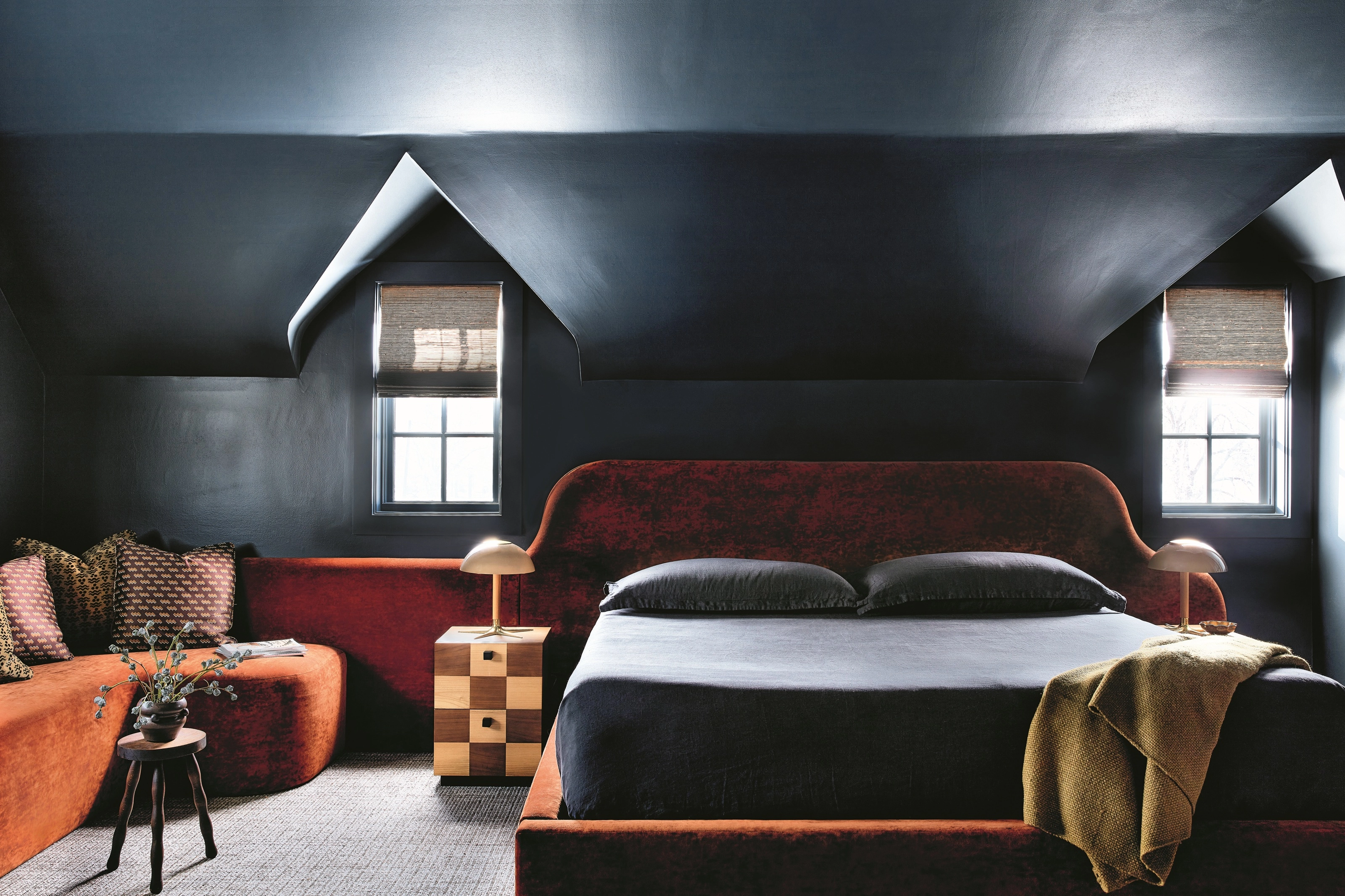 Be it a lacquered wall or a keenly situated glossy-looking furniture piece, a high shine finish is a particularly illuminating design trick in a dark and moody bedroom where an element of reflection feels key. "For this bedroom, we selected a deep red scheme that threads through the space in layered ways, from the fitted geometric carpet to the fabric wall paneling," says interior designer Peter Mikic. "Brass accents take on a central role: the unlacquered brass bed frame introduces a sculptural weight that breaks up the warmth of the palette."