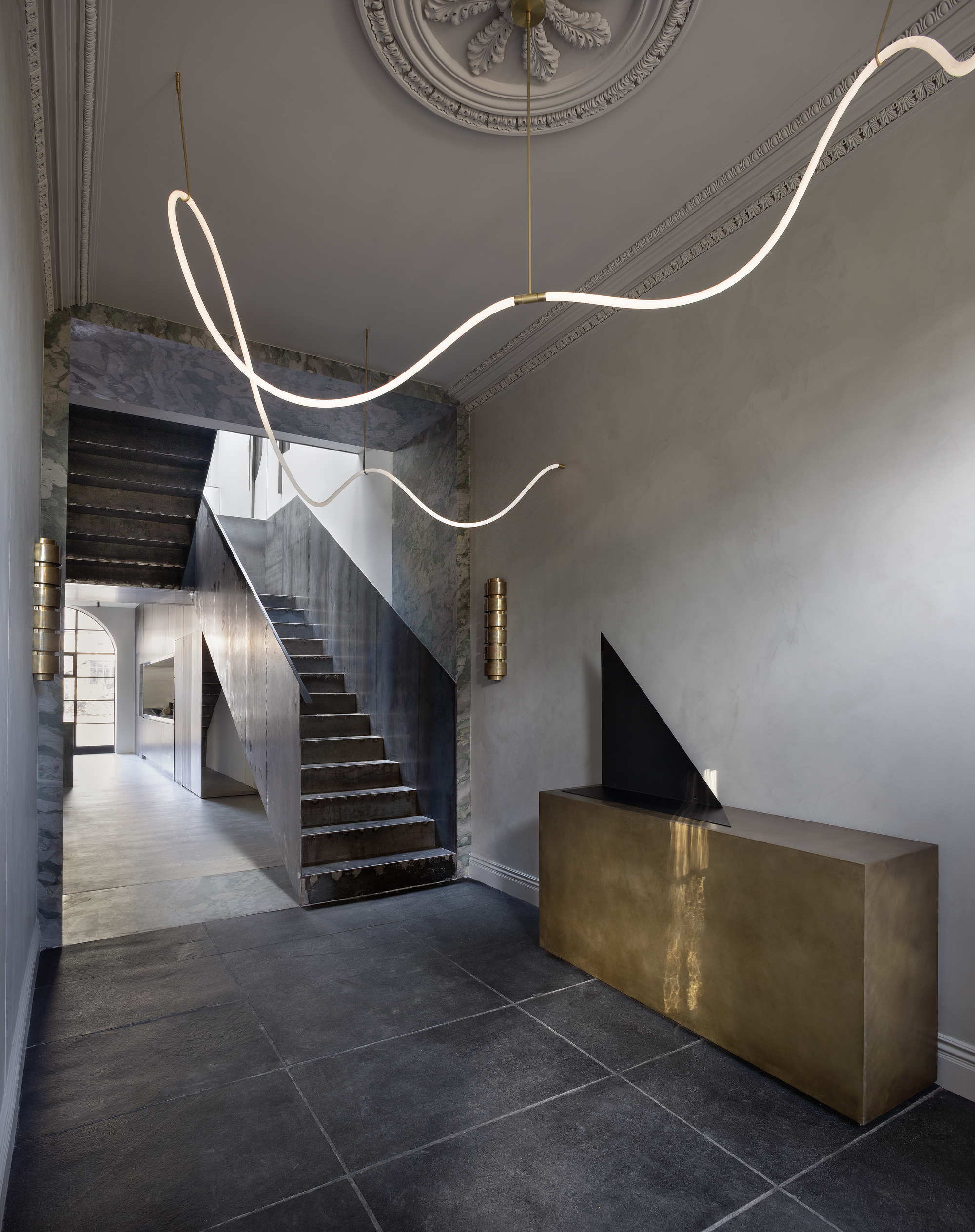The hardworking flagstone entryway flooring idea, seen here in the hall, pays homage to the original floor which would have been laid in 1850, eliciting an air of informality and authenticity off the bat. “The brass accents and art-like lighting provide contrast, achieving a sense of harmony,” says Róisín.