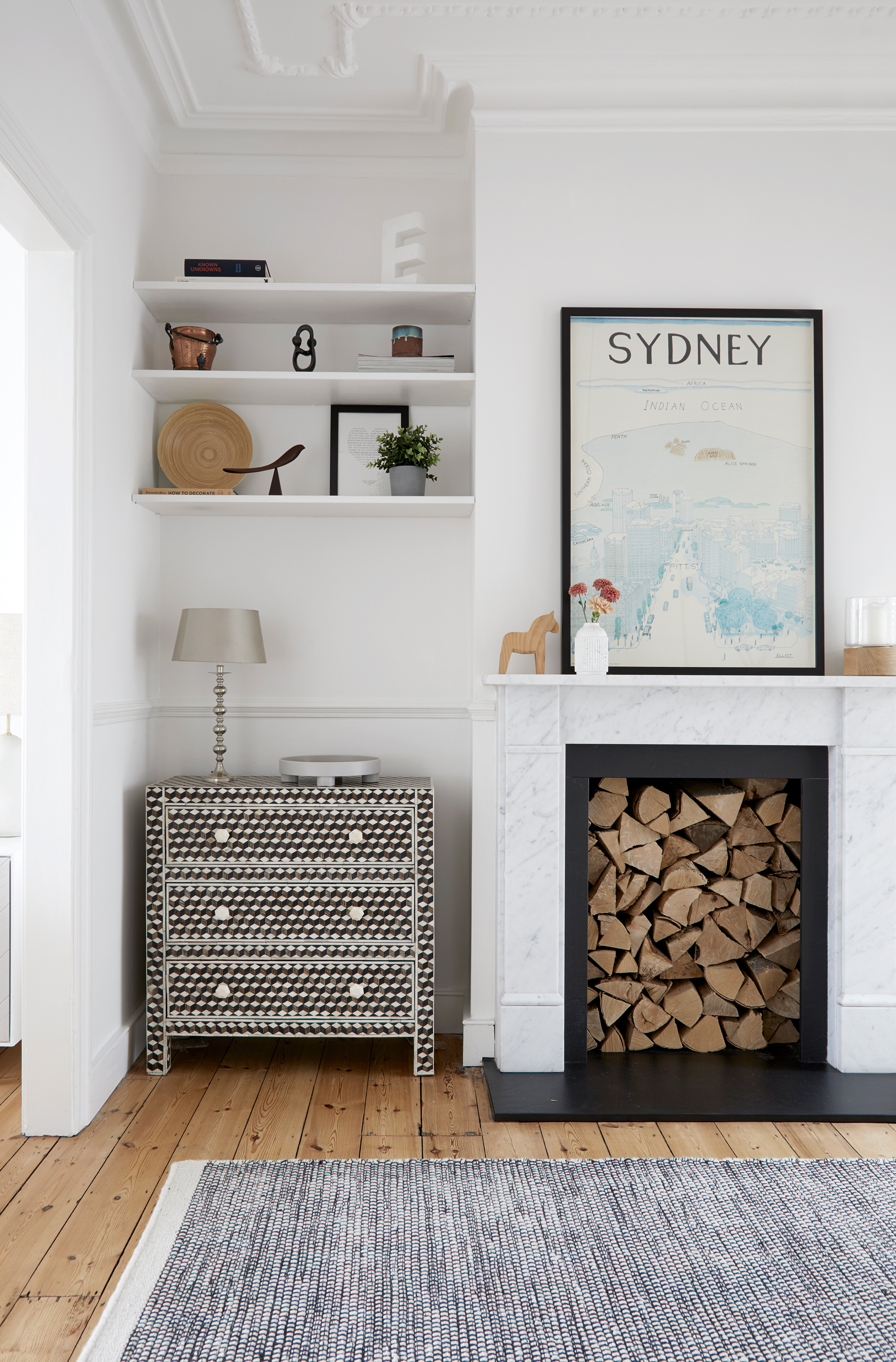 Previously the room had a large log basket, which took up a lot of valuable floor space. 'The alcoves on each side of the fireplace were not being used at all and the alcove on the right was the perfect and practical alternative for storing the logs,' Carine says. 'We also found a local log company who brilliantly cut the logs to size, and kept the details on file so reordering was quick and easy.'