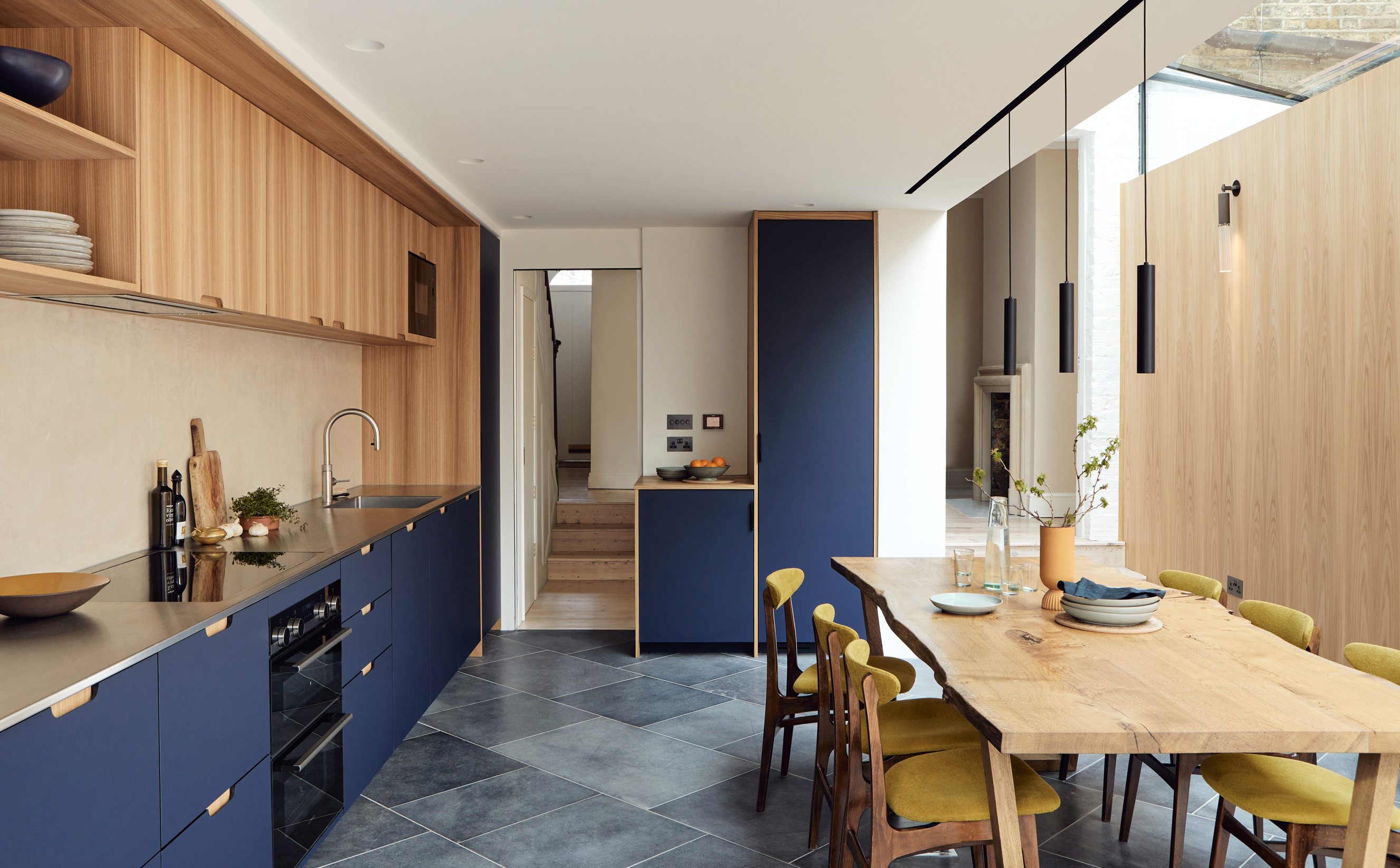 Fiona adds: 'The client opted for our MATT-V for the majority of the kitchen, which comprises blue Fenix laminate on a black Valchromat core. They combined this with WOOD-E fronts in American red elm for the upper cabinets.