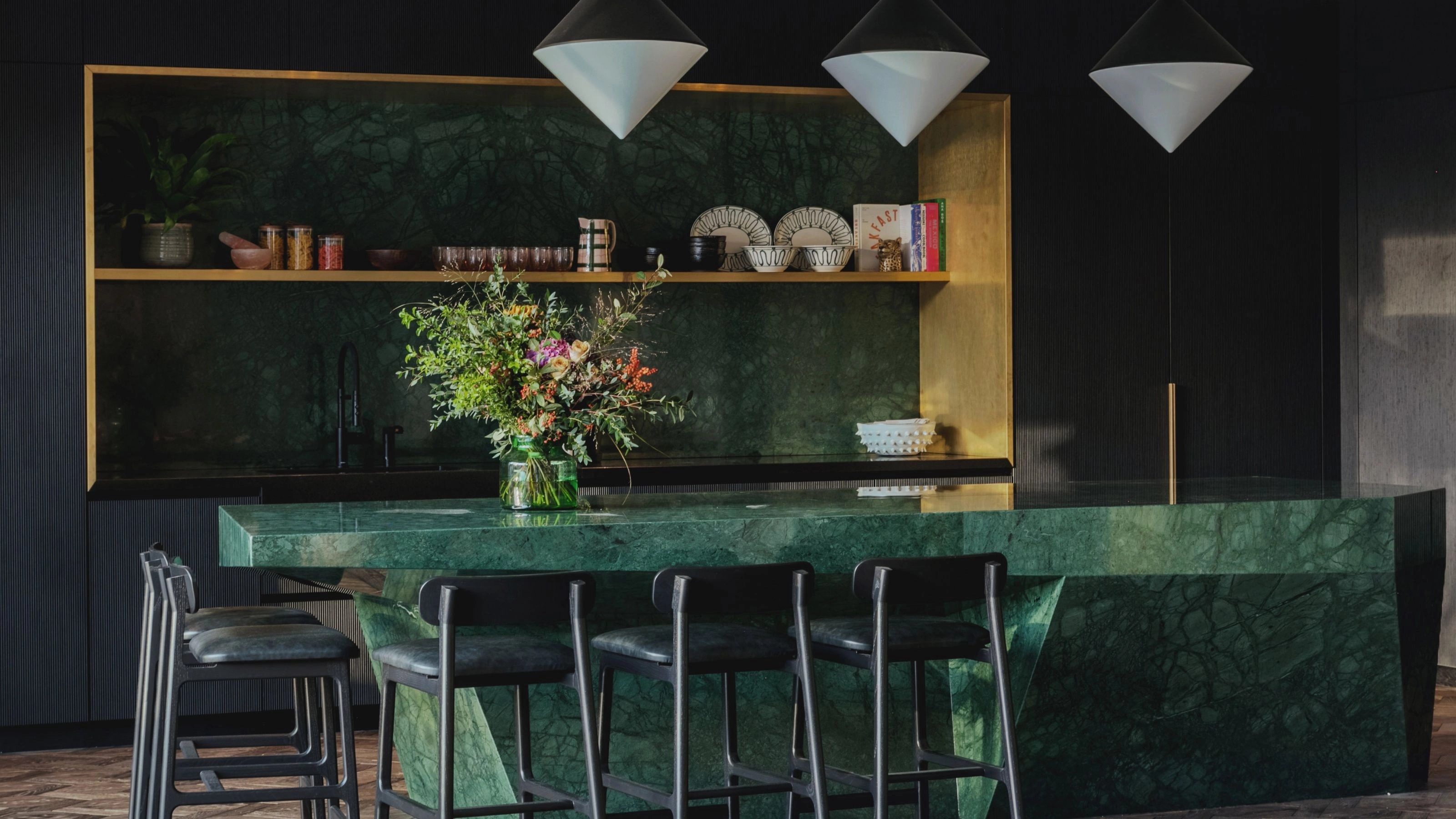 “Connected to the living area, this statement kitchen is part of a larger entertaining space, so all our restraint went out the window to create a showstopping environment for this young family,” says Tiffany Duggan, founder of Studio Duggan. “I wanted the kitchen island to feel almost otherworldly, as if it were a single, solid block of marble. We clad the island in Verde Guatemala stone, which brings immense color depth and vibrancy—far superior to a painted finish. For practicality, we left the working side in reeded black oak. There are plenty of hidden details that make this a hardworking kitchen as well as a beautiful one—larders, a coffee station, and a whopping four ovens, all tucked behind retractable doors, allowing the space to transform into a hive of activity at the drop of a hat.”