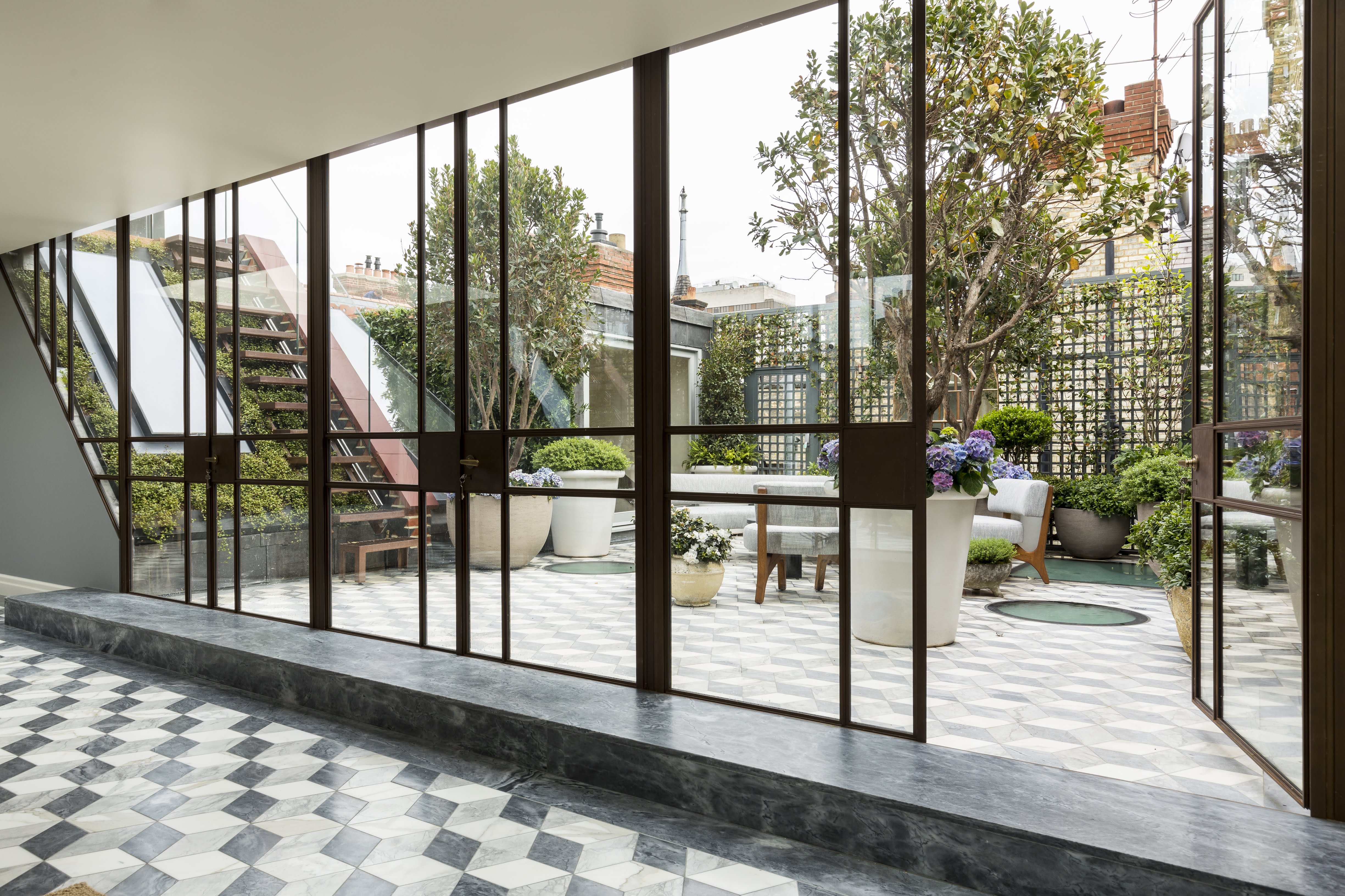 ‘The east terrace is the central point of the apartment and is visible immediately on entering the home,’ says Tor Cameron. ‘It is a suitably eye-catching space, where dramatic planters with large trees and pretty seasonal plants sit alongside an array of reclaimed pots, complementing the three-tone cubic-style tiling. The result is a delightful melange of textures and tone.'