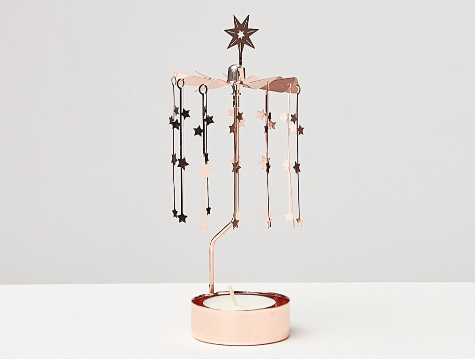 Lights are an essential part of Christmas and the rose gold Stars & Moon Rotary Tea Light Holder, featuring suspended stars around a rotating wheel is perfect for Christmas, reflecting light at all angles.
