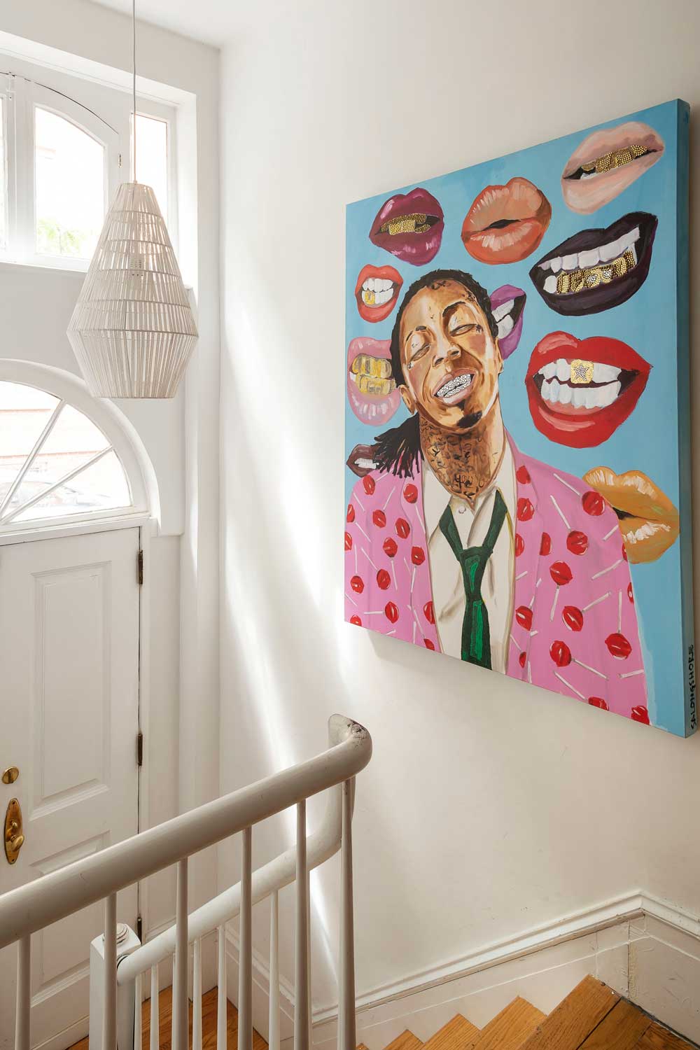 Inside the front entrance, the hanging light fixture was switched out to their own design and a bold artwork greets the family and their friends.