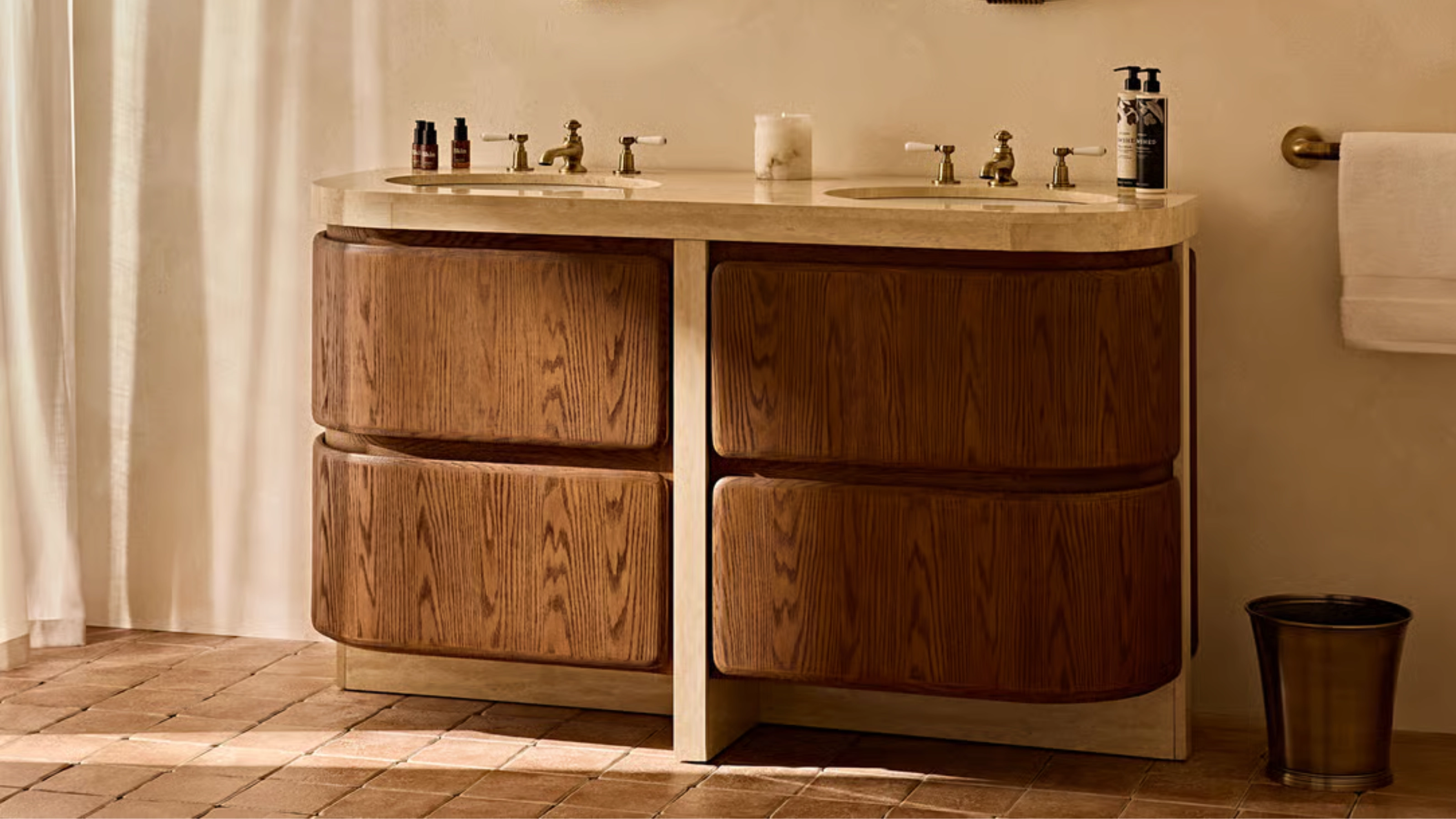 And while the collection is full of drool-worthy options, this particular vanity is my standout star. With its cool, curved wood drawers and sleek, travertine counter, this is the type of piece you'd design your entire bathroom around.