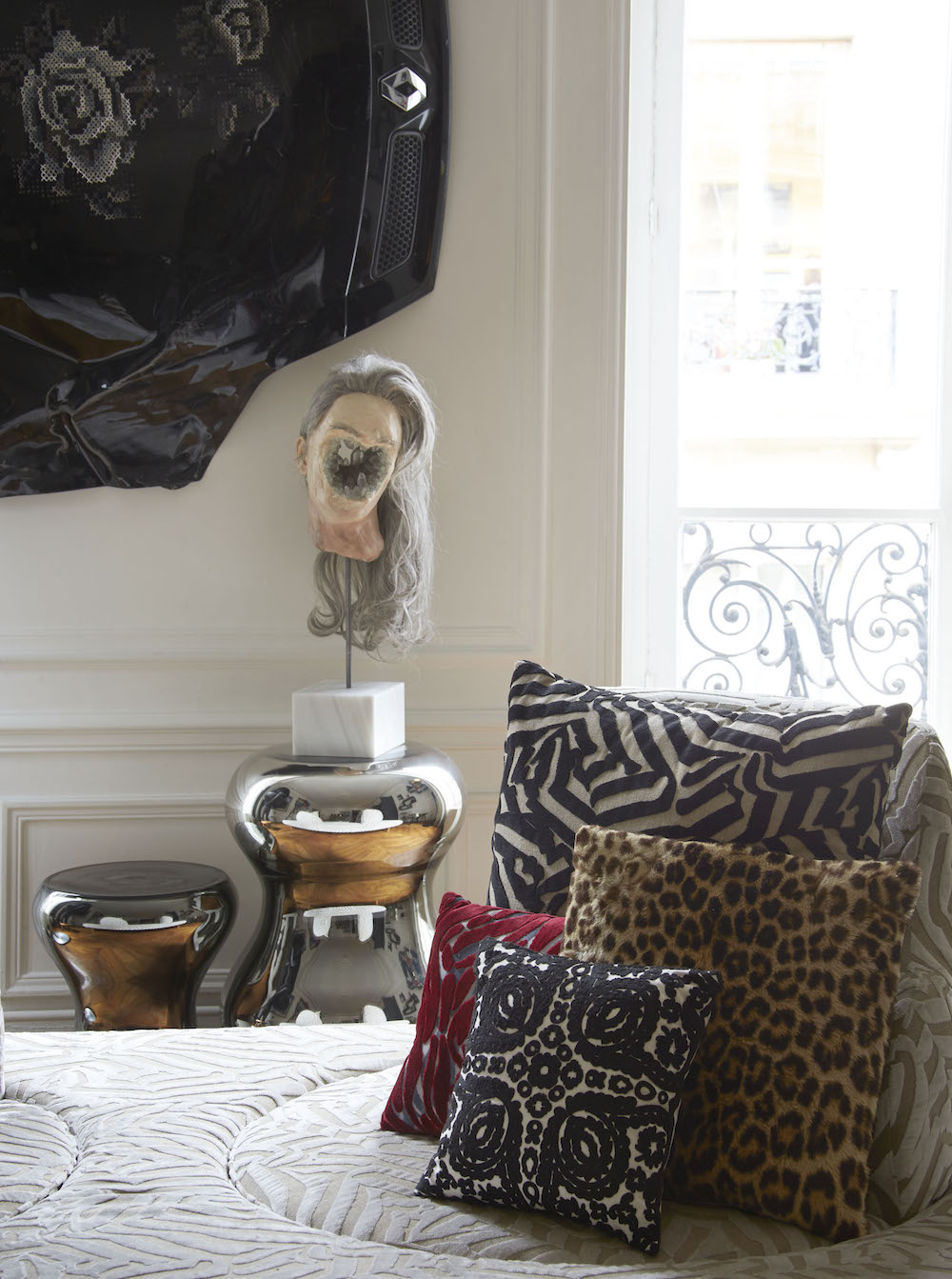This contrasted mix is their signature and is typical of the French decor tradition, going from Madeleine Castaing to Henri Samuel or even Jacques Grange. The green chair is a classic Maarten Baas piece. The cubic black stool is "Furplay" by Sacha Walckhoff for Gallery Gosserez and Pouenat. The photograph is by Thierry Fontaine (Les Filles du Calvaire Gallery).