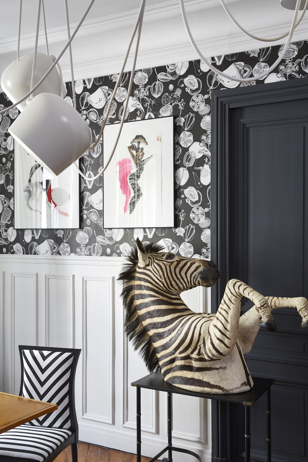 The owners decided to use a bold and dramatic Christian Lacroix Maison wallpaper with a black background. It is a very graphic set up.