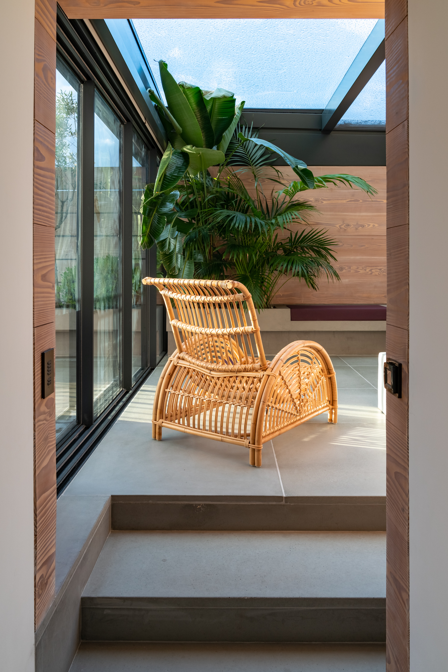 Collaborating with Diapo and Webb Yates Engineers, Michaelis Boyd's team created this unique sculptural staircase, made from perforated red steel and floating above the living room floor. “With this staircase we wanted to create a statement piece that was both sculptural and functional,” Alex Michaelis tells us.