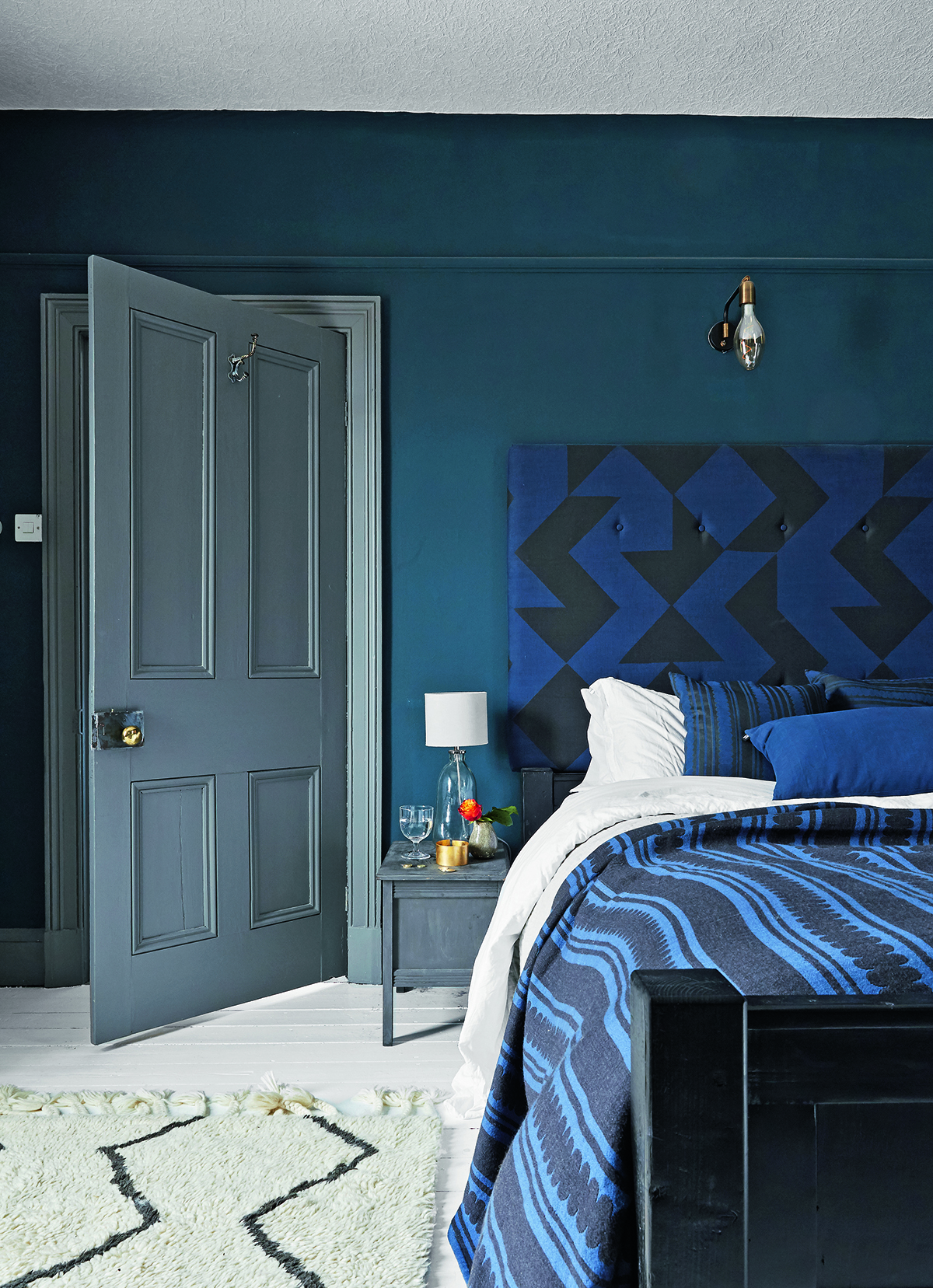 The master bedroom has a warm, cocooning feel thanks to the rich colour palette and bold textiles.