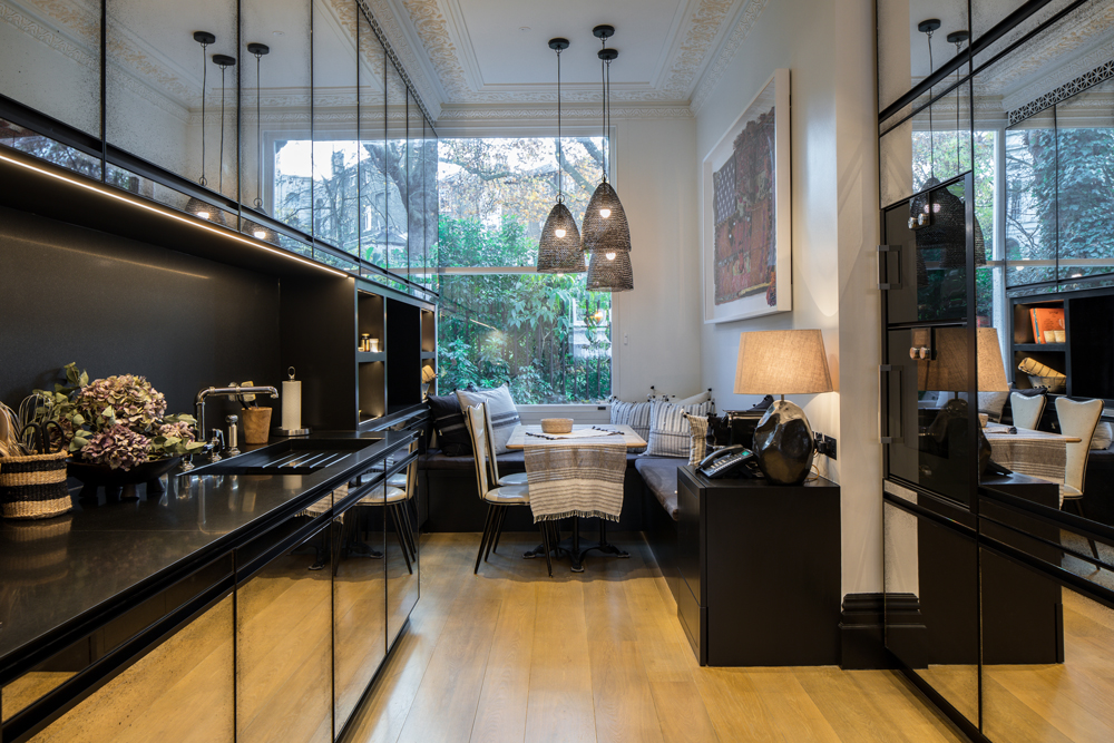 Mirrored cabinets bounce light around to keep the long kitchen feeling bright, and the antiqued foxed detailing are in keeping with the house's modern-traditional look.