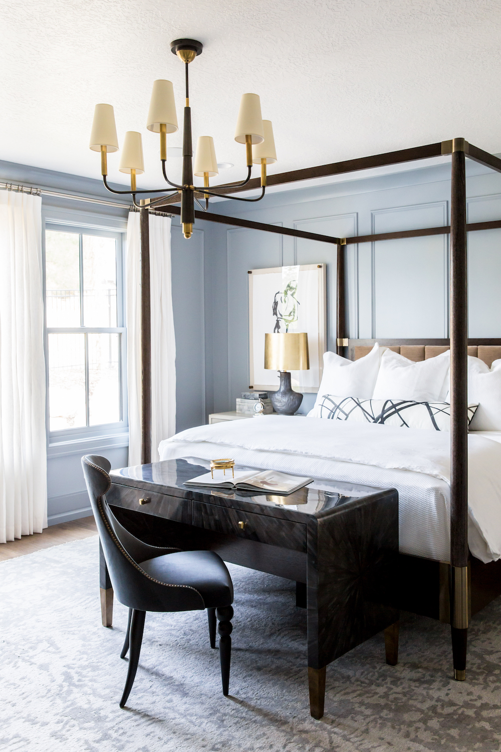 With 10 foot ceilings design firm Alice Lane knew that they could get away with a tall canopy bed that would anchor the room and add a sense of grandeur. The designers added the Garlon bone inlayed desk from Made Goods at the end of the bed to create a functional work space in the bedroom.