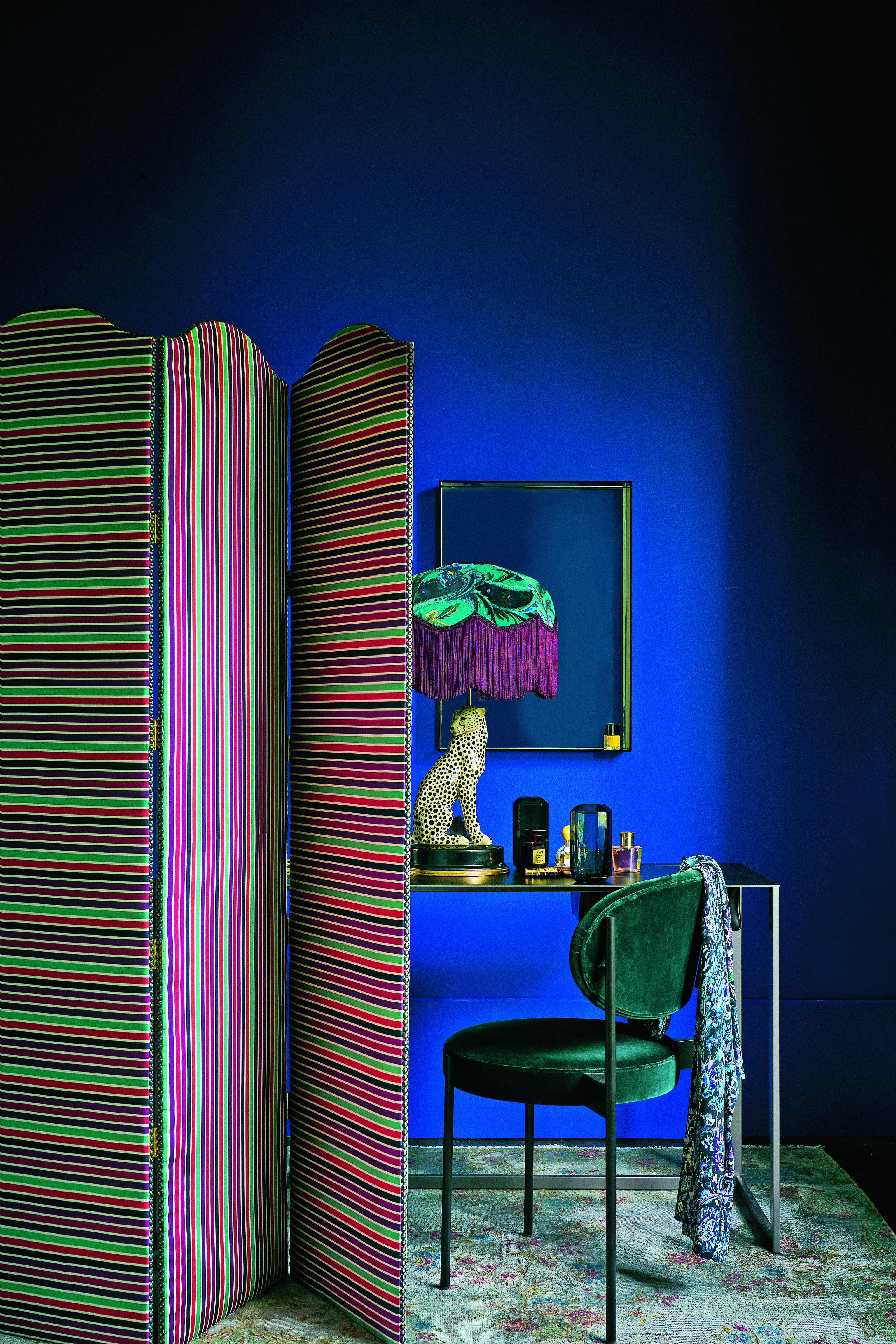 For a hit of Forties glamour, display compelling designs in front of a classic silk textile reimagined as an oversized print.