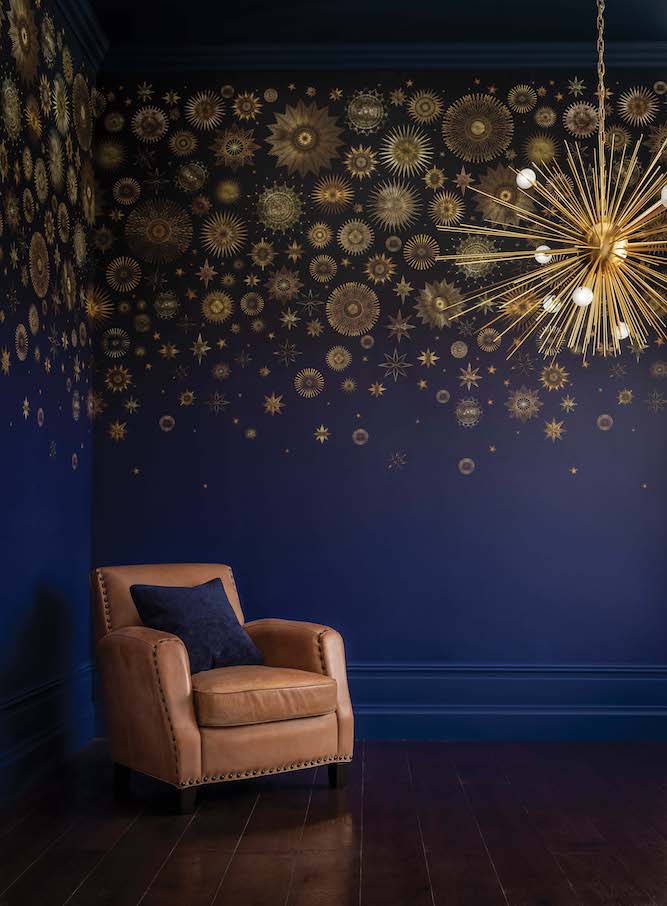 A large-scale wrap-around inky blue night-time sky was imagined for the dreamy Celestial scheme. A bold and dramatic skyscape dotted with hand-drawn golden stars to transport you to a magical and theatrical place. The rich, saturated blue hue is embellished with pops of glittering metallics.