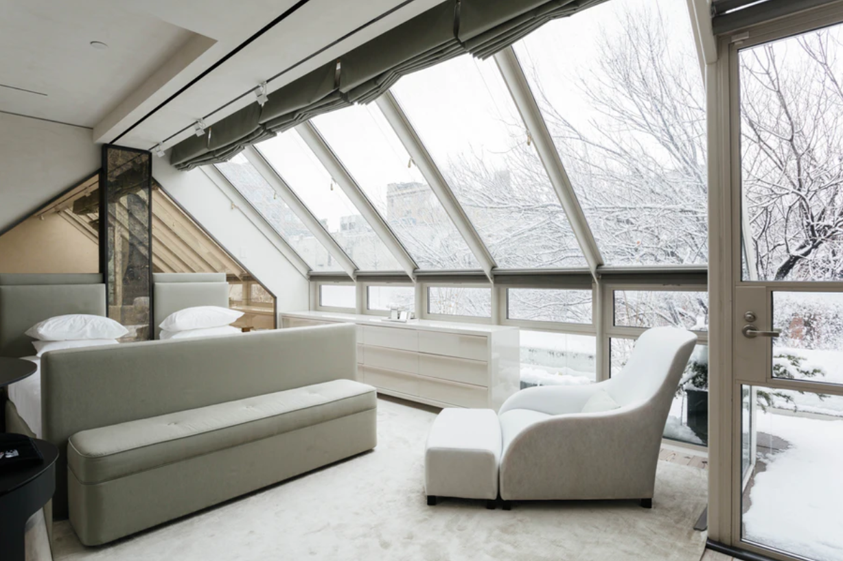The bedroom is housed in the roof, wherethe sloped ceiling was replaced entirely with glass, flooding the room with natural light. Usually these attic rooms can feel dark and cramped, and have a lack of natural daylight, but here the room feels like it could extend outward, and the glass sloped ceiling makes it feel larger and taller.